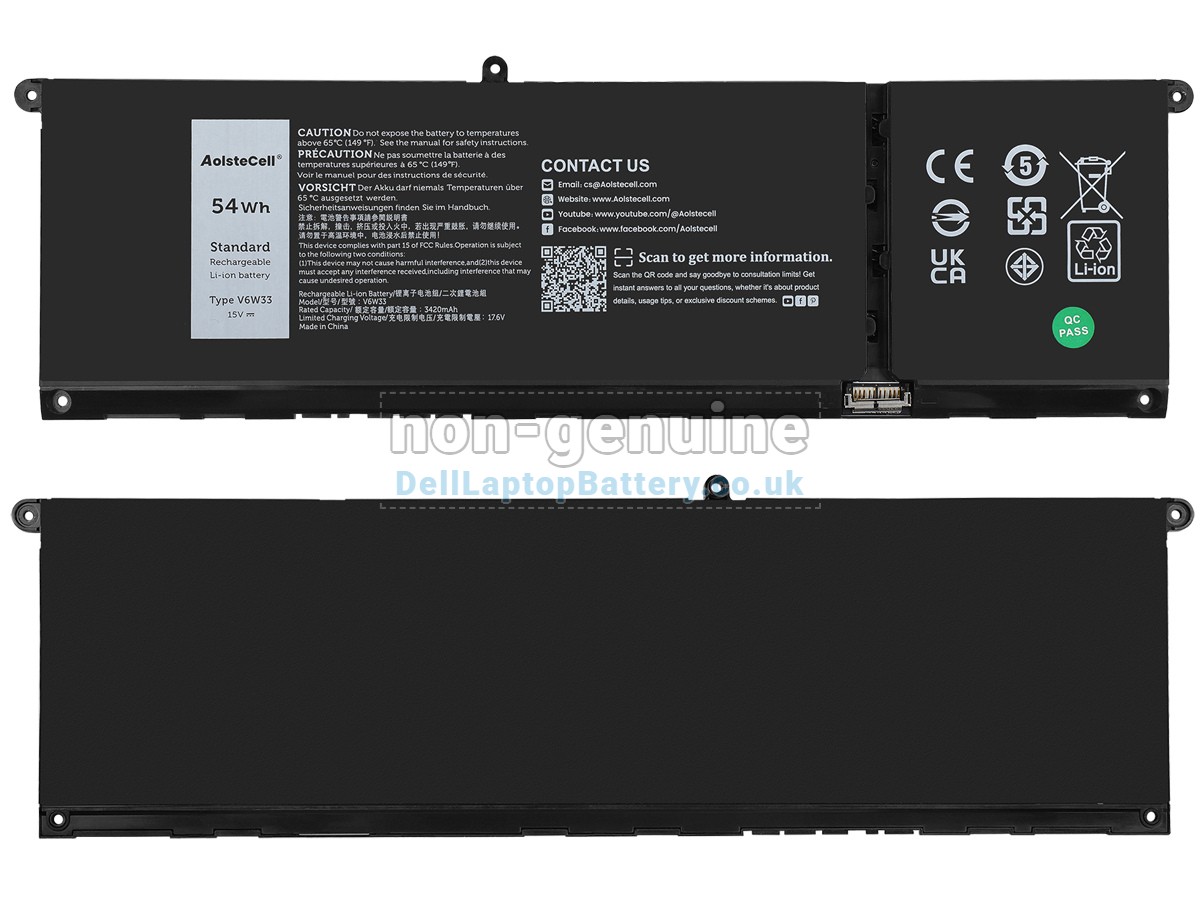 We offer brand new replacement Dell V6W33-A battery with high-quality cells (SANYO, BAK, SAMSUNG, etc.) that are as durable as the original batteries. All replacement batteries for Dell V6W33-A have been tested and proven to match or exceed the performance of the original battery and are 100% compatible with the original manufacturer's specifications. Every battery for the Dell V6W33-A laptop passes Dell system testing to ensure the safe use of your Dell laptop.