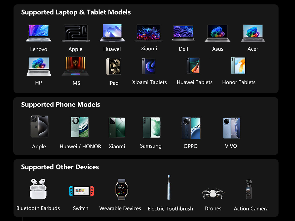 Designed for high-performance devices, this 20000mAh power bank delivers true 100W fast charging, supporting PD 3.0 and multiple fast-charging protocols. It can effortlessly power USB-C laptops, tablets and smartphones at full speed. In laboratory tests, it charges a MacBook Air (M3) to 50% or an iPhone 17 Pro to 60% in just 30 minutes, making it an ideal companion for work, travel and daily use when time matters most.